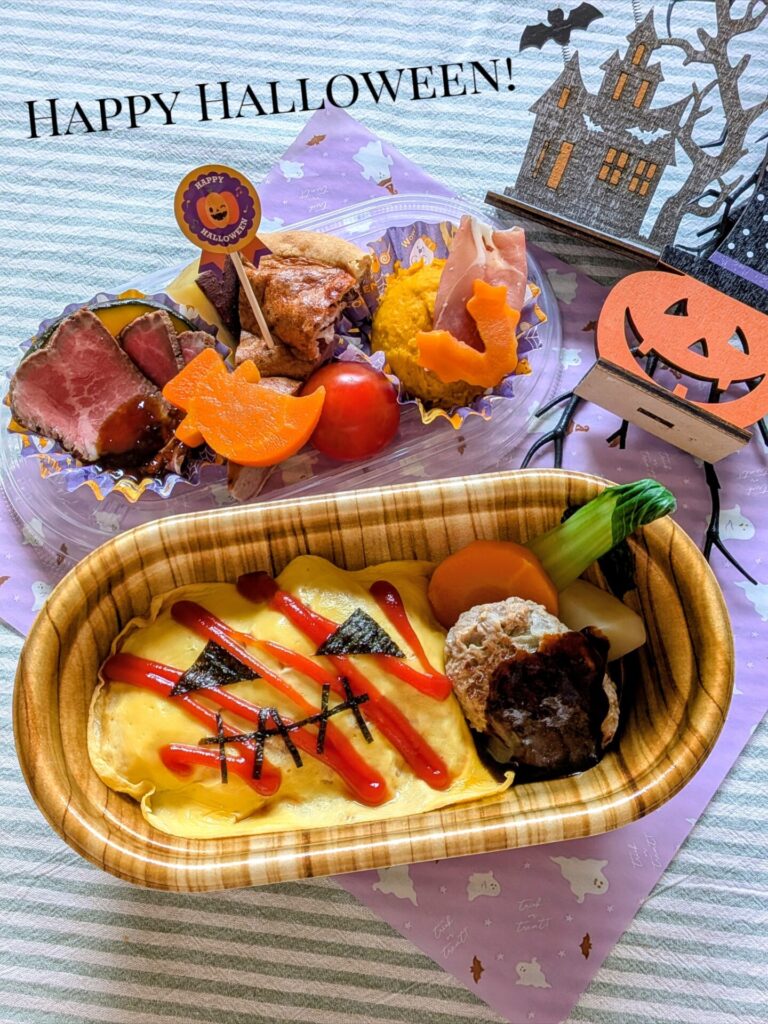 上段には、ハロウィンをイメージしたキッシュなどのお惣菜を、