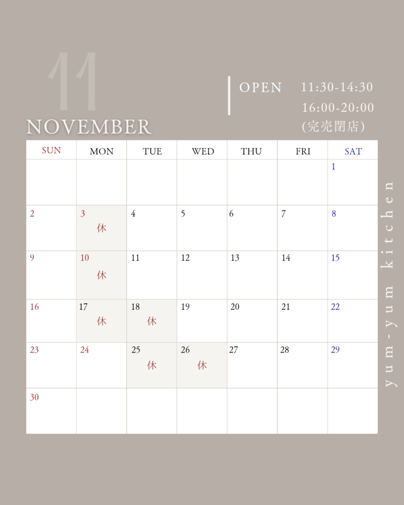 お休みが不規則ですので、ご予約ご来店の際は、どうぞご確認くださいませ。