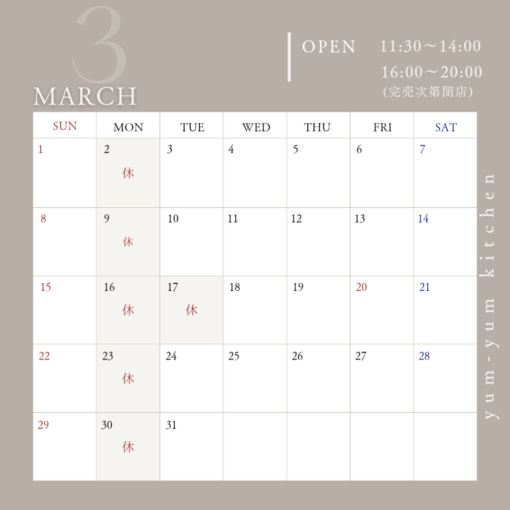 3月のお休み&臨時休業のお詫び 投稿日 2026年2月22日 著者 yumyumpapa カテゴリー Uncategorized カテゴリー 営業のご案内 シェア ツイート LINE コピー 3月のお休みです。月曜日定休に加え、17日(火)もお休みです。ぜひご確認のうえ、ご予約ご来店くださいませ。店主、咳のしすぎで肋骨をポッキリ骨折いたしまして・・・。先日2月17,18日と臨時休業いたしました。期間中、ご来店お電話等くださったお客様には、大変ご迷惑をおかけいたしました。今は、皆さまの温かいお声掛けで、痛いながらも元気に営業しております!皆さまも、咳の力加減にはお気を付けを。それでは、3月もたくさんのご来店心よりお待ち申し上げます。 シェア ツイート LINE コピー